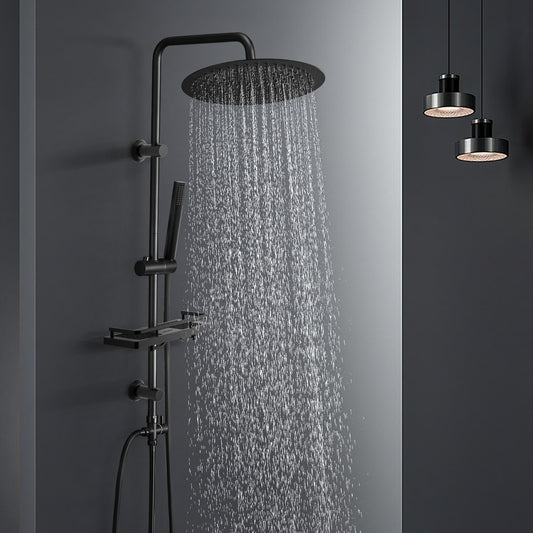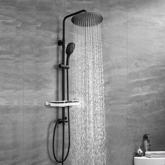 JOHO Duschsystem Matt Schwarz mit Ablage, Duschset ohne Duscharmatur mit Rund Regendusche Handbrause