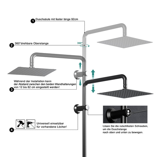 JOHO Edelstahl Duschstange mit Handbrausehalter und Gewindeadapter, Wandstange Regendusche Brausearm Brausestange Duschsäule mit fester Länge 92cm Schwarz
