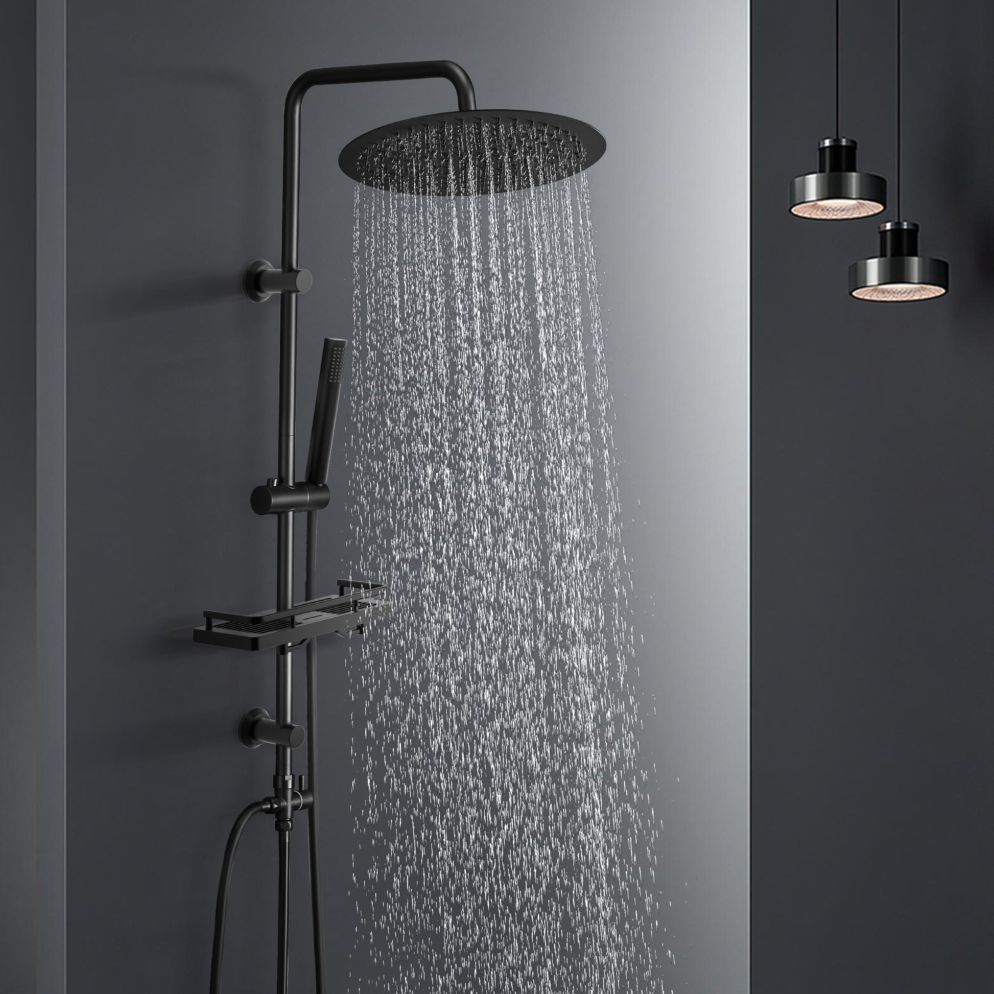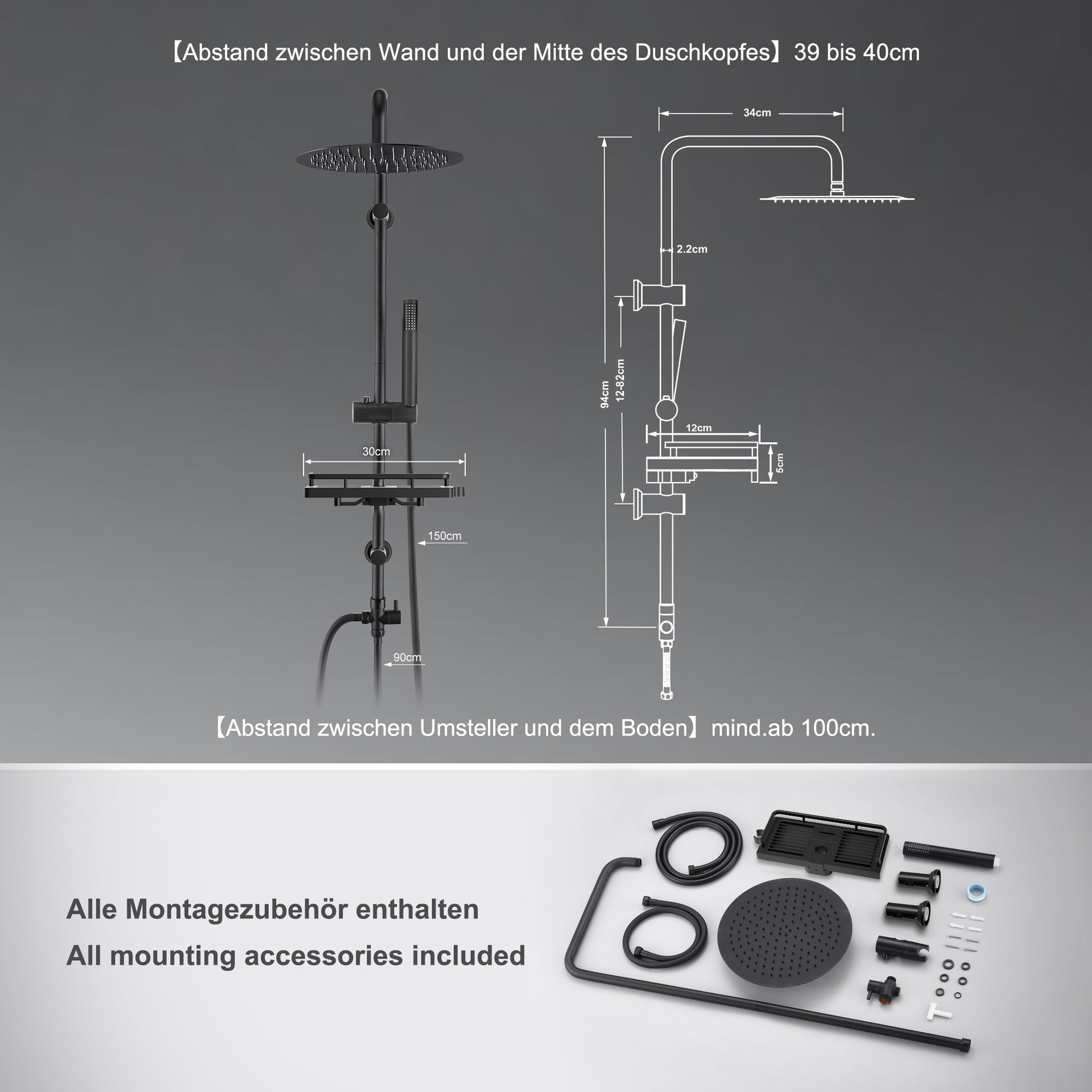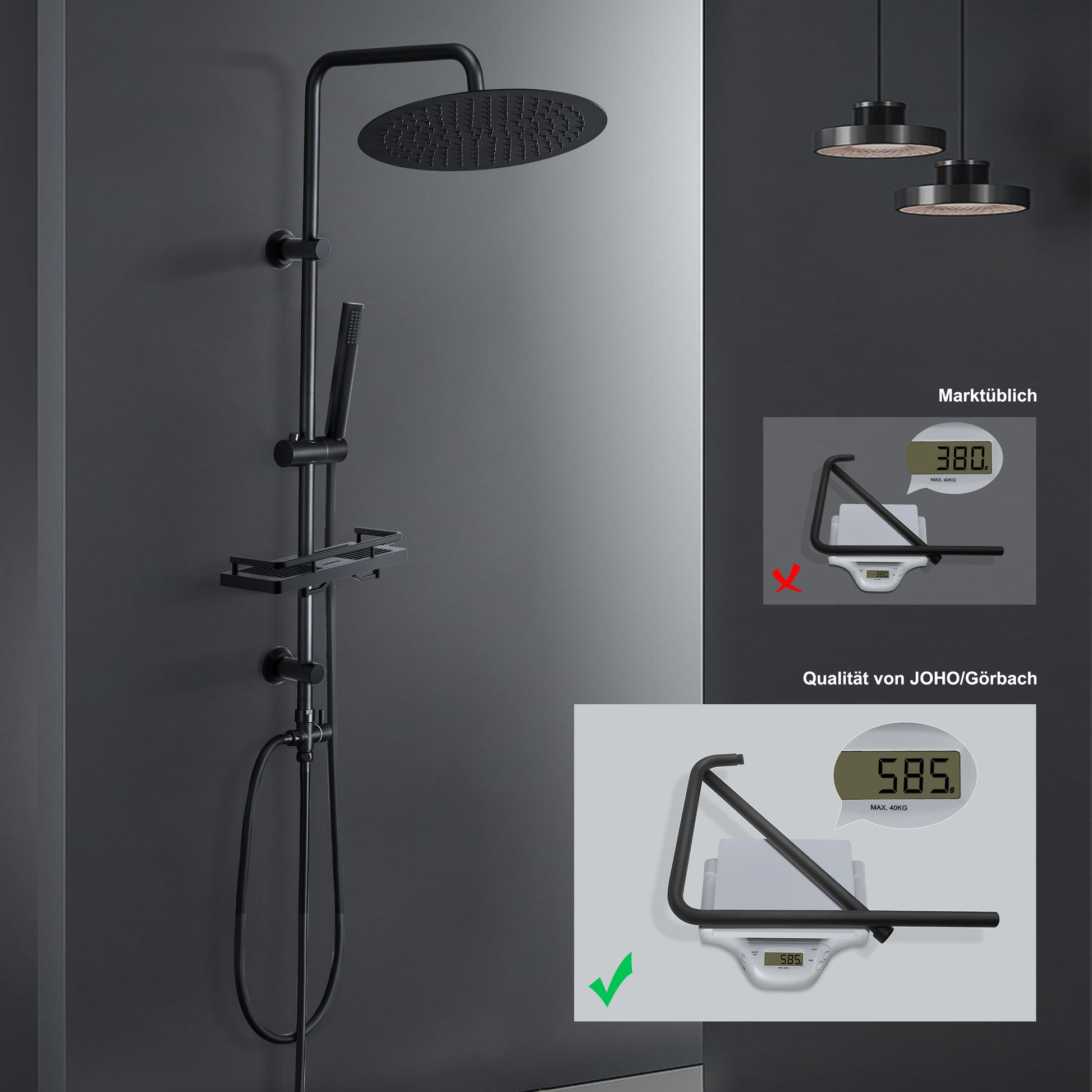 JOHO Regendusche Duschsystem 92 CM mit Ablage Kopfbrause Rund Schwarz