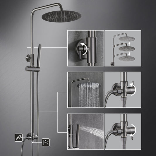 • JOHO Edelstahl Duschset ohne Armatur, Regendusche Duschsystem mit Duschkopf, Duschstange, Duschschlauch, Rond Kopfbrause Gunmetal Grau