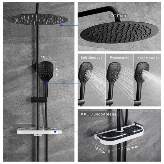 JOHO Duschsystem Matt Schwarz mit Ablage, Duschset ohne Duscharmatur mit Rund Regendusche Handbrause